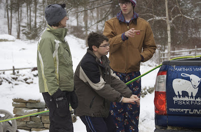 I love farm chores on the weekends because Patrick's home from the Vineyard and Logan's with us; Harry lives with us full-time now. Chores are just a lot more fun when we do them together. I took these pictures this morning and they crack me up, because they really show everyone's morning personality.Logan has learned a lot of compassion from the sheep and goats.